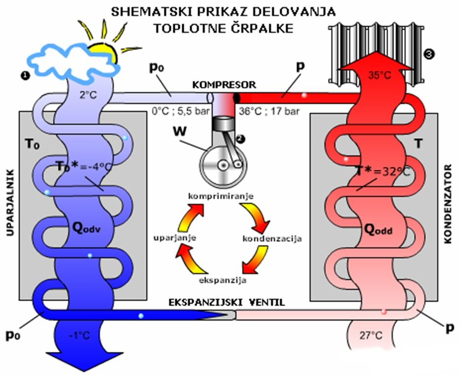 V uparjalniku tekoča delovna snov hladivo prevzame brezplačno toploto iz okolice. Hladivo pri tem pri nizki temperaturi izpari. Kompresor, ki ga poganja elektrika, vsesa plinasto hladivo, ga močno stisne (hladivo se pri tem segreje) in potisne po cevi naprej.
