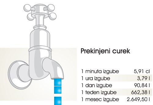 vode. Tudi če pipa pušča, lahko izgubite dovolj vode, da bi v enem mesecu napolnili kopalno kad – zato redno preverjajte, ali so pipe dobro zaprte.