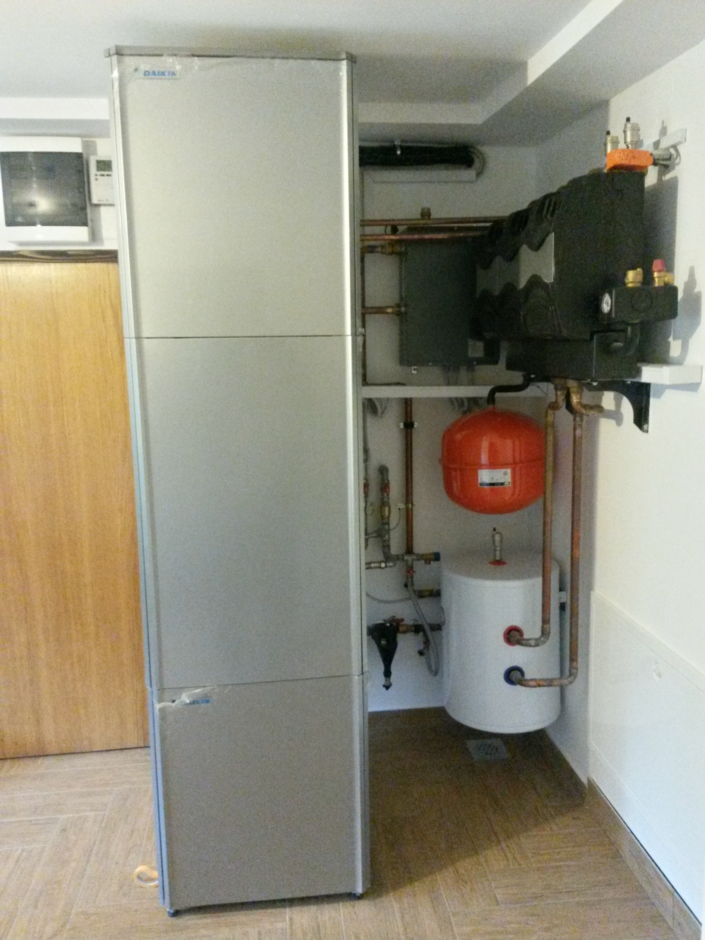 uparjalniku prevzame toploto iz okolice … Ko se voda v izmenjevalniku toplote dovolj segreje, krmilno vezje vklopi črpalko, ki vzpostavi kroženje vode v ogrevalnem sistemu. Topla voda ogreva različna grelna telesa: bojler za sanitarno vodo, radiatorje, sistem talnega gretja … Najučinkovitejše je izkoriščanje talne vode. V globini 7 m je namreč vse leto stalna temperatura 6–10 °C. Talno vodo črpajo iz črpalnega vodnjaka in jo po uporabi ohlajeno približno za 4 °C vračajo v zemljo prek ponikalnega vodnjaka, ali pa zemeljska toplota prehaja v sistem plastičnih cevi, položenih 1,5 m globoko v tla, skozi katerega se pretaka hladilno sredstvo. Za vsak kvadratni meter ogrevane stanovanjske površine potrebujemo približno 2,5 m cevi. V ugodnih razmerah taka naprava lahko zadostuje za ogrevanje stanovanjske hiše.