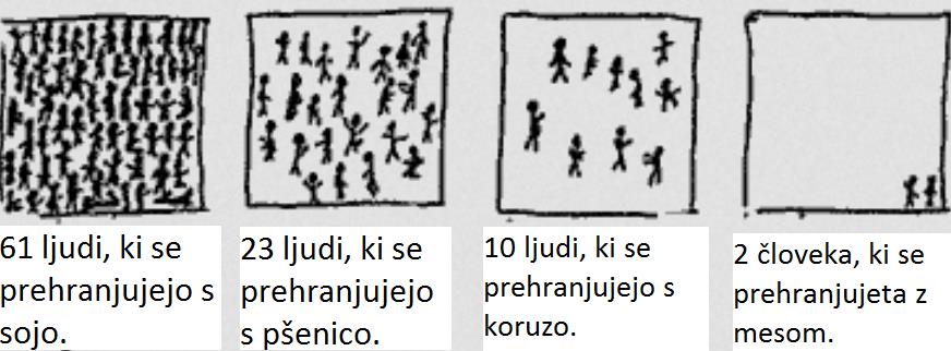 Živali pridelajo 10-krat manj hrane, kot je pojedo, zato je potrebne tolikokrat več pridelovalne površine, tolikokrat več energije za žetev, tolikokrat več vode, tolikokrat več pesticidov itd.