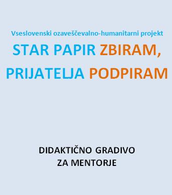 S sloganom STAR PAPIR ZBIRAM, PRIJATELJA PODPIRAM mlade, mlajše in najmlajše spodbujamo in ozaveščamo, da z aktivnim zbiranjem starega papirja pomagajo svojim vrstnikom, hkrati pa skrbijo za čistejše okolje, za ohranjanje naravnih virov ter izražajo socialni čut, solidarnost in dobrodelnost.