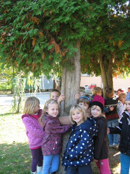 Otroci v naši skupini so spoznavali drevesa na dvorišču vrtca z vsemi čutili, spoznali razlike in podobnosti, njihovo uporabnost, koristnost. Na našem dvorišču raste jablana, smreka, cipresi, bor, ob ograji pa oreha.
