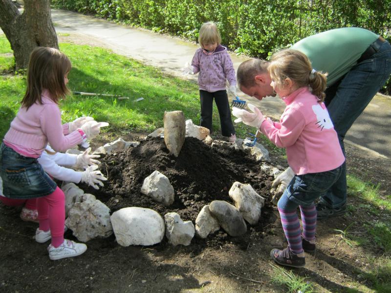 Kaj, če bi ga naredili tudi pred našim vrtcem? Prosili smo starše za pomoč pri zbiranju kamnov in sadik. Hišnik Jani pa je pomagal pri prenašanju težjih kamnov in pri dovozu zemlje. Otroci so pridno pomagali po svojih močeh in spremljali kako nastaja skalnjak. Polepšali smo del zelenice pred vhodom v vrtec, skrbeli bomo tudi za urejenost in rast cvetlic.