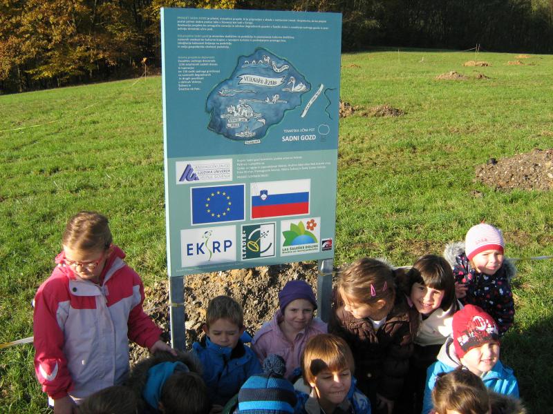 V petek, 9.11.2012, smo se na povabilo direktorice Ljudske univerze Velenje ga. Brigite Kropušek Razinger, iz Vrtca Velenje, udeležili sajenja nekaj najbolj avtohtonih sadnih rastlin, ob velenjskem jezeru. V ta namen pripravljeni zgibanki, nas je Gospod Črvek popeljal na TEMATSKO UČNO POT: SADNI GOZD. Posamezne vrste sadežev (kutina, oreh, nešplja, kostanj, jablana, murva, sliva, višnja, hruška, kosmulja, malina, robida, češnja, skorš, borovnica, višnja, leska) so poslikane na tablah, ki nas poučujejo o pomenu avtohtonega in ekološko pridelanega sadja, dokaznih zdravilnih učinkih sadežev in nasvetih za praktično uporabo sadnih rastlin.