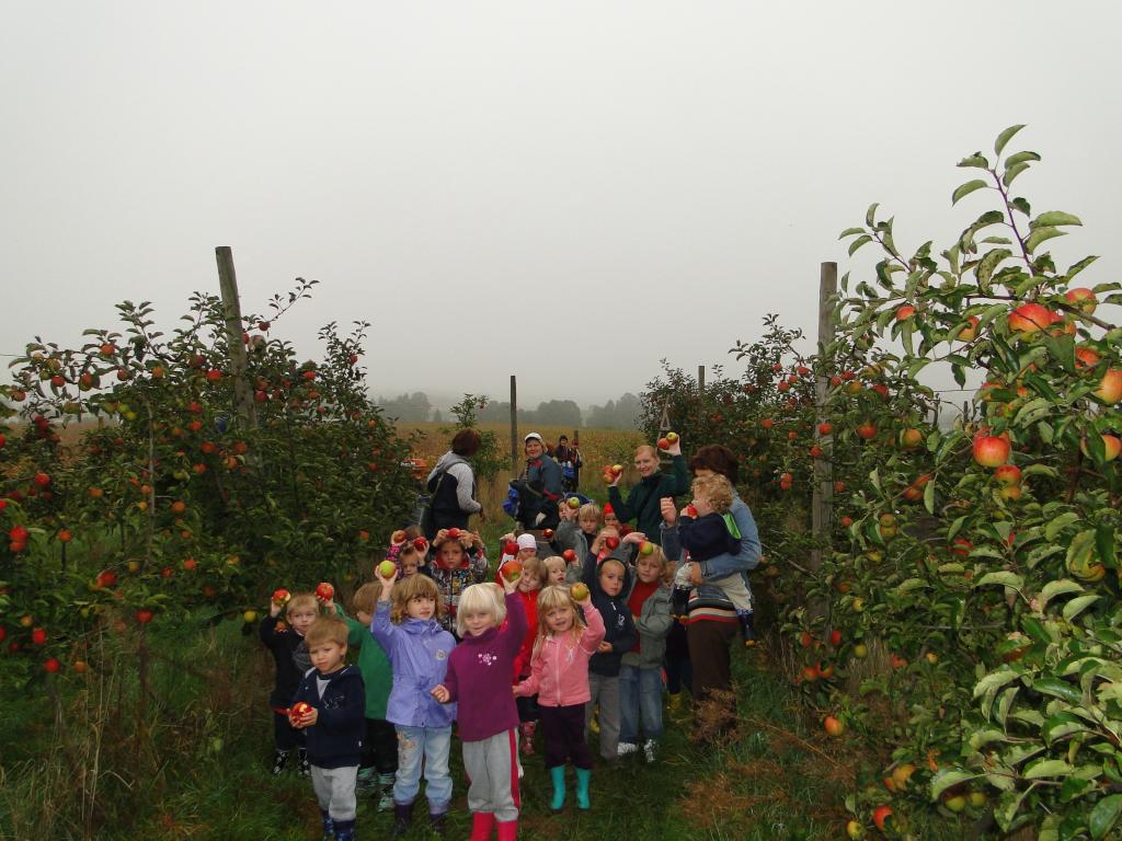 V začetku meseca oktobra smo obiskali bližnji sadovnjak, kjer smo si ogledali kako so delavci obirali jabolka iz dreves, ki se imenujejo jablane. V obiranju jabolk pa so se lahko preizkusili tudi naši otroci. Spoznali so vse potrebne pripomočke, katere rabimo za obiranje jabolk (vedra, veliki zabojniki, lestev…). Nekaj jabolk pa smo si nabrali v vrečo in jih odnesli v vrtec, ter se z njimi posladkali.