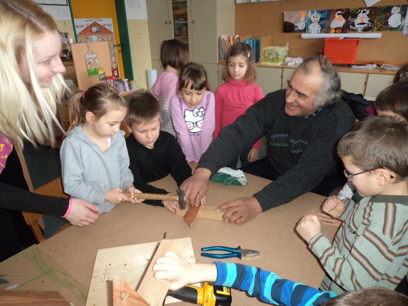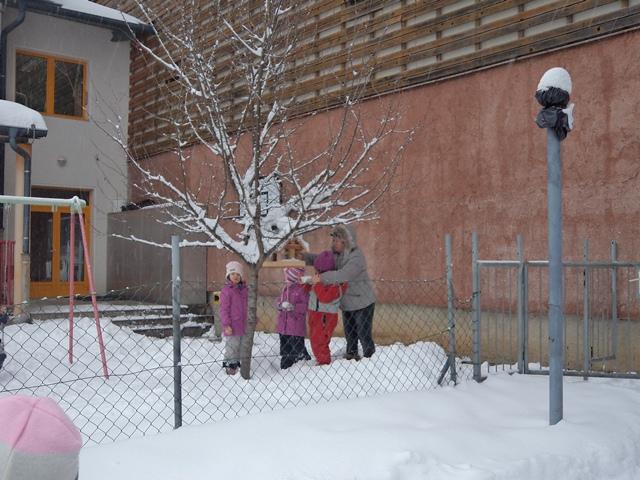Tinkara se je dogovorila s svojim očkom, da je pripravil material za izdelavo ptičje hišice. Nato je prišel v skupino in skupaj smo izdelali ptičjo hišico. Postavili smo jo na drevo na igrišču in vsak dan nosimo hrano za ptice, ki jo otroci prinašajo od doma. Opazujemo vesele ptice in se veselimo z njimi, saj vemo, da jim bo tako zima lažje minila in nam bodo spomladi vračali veselje s svojim petjem.
