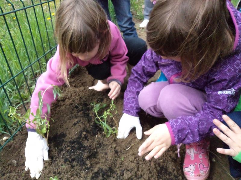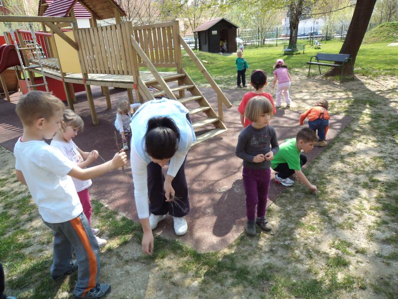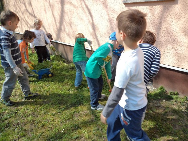 Sicer pa skozi vso leto otroci pomagajo pri urejanju okolja; pozimi pomagajo čistiti sneg (po svojih zmožnostih), ob vsaki košnji igrišča grabijo travo, jo s samokolnicami odvažajo na kompostnik, vsaki dan pometajo okoli peskovnika, skrbijo za svoje zeliščne in druge gredice na igrišču, svoje posvojeno drevo (grabijo listje, pobirajo suhe vejice…).