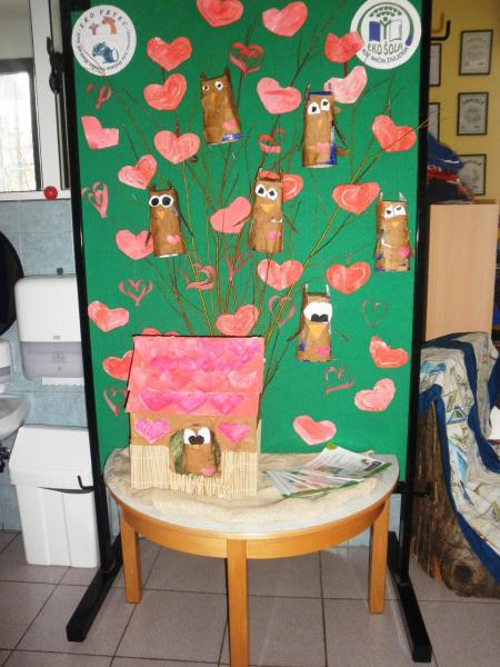 Po prazničnem decembru nam je zopet uspelo najti čas za naš krožek. Ustvarjali smo na temo nagradnega natečaja, življenje v gozdu. Odločili smo se ustvariti sovice, ki smo jih še odlično povezali z Valentinovim. Nastal je pravi gozd prijaznih in ljubeznivih sovic.