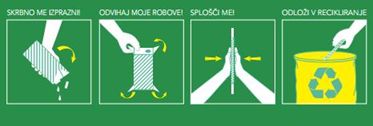 Kartonska embalaža za mleko in sokove je sestavljena večinoma iz treh materialov: kartona, polietilena in aluminija. Ko je prazna, je pomembno, da jo sploščimo oziroma stisnemo in odložimo v rumeni zabojnik za odpadno embalažo. Stisnjena embalaža namreč zavzame kar 20-krat manj prostora v zabojniku, odlaganje med odpadno embalažo pa zagotovi njeno recikliranje in nadaljnjo izdelavo novih izdelkov, kot so lepenka, karton, papirnate brisačke in robčki, kartonska embalaža za jajca, papirnate vrečke, pisarniški material in drugi izdelki.V Sloveniji smo lani ločeno zbrali približno 2000 ton odpadne KEMS, kar je približno tretjina celotne embalaže, dane na slovenski trg. Delež ločeno zbrane odpadne embalaže v zadnjih letih postopoma narašča, k čemur pripomorejo tudi projekti, kakršen je Eko-paket.