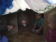 Velike škatle smo uporabili za hišice. Otroci so vanje plezali, jih odpirali in zapirali ter spoznali, da je v zaprti škatli temno. Vanjo so povabili tudi prijatelja in kmalu ugotovili, da je v škatli lahko tesno. Postavili smo si tudi velik grad iz več velikih škatel ter platna in v njem je bilo dovolj prostora za vse. Seveda smo škatle tudi poslikali.