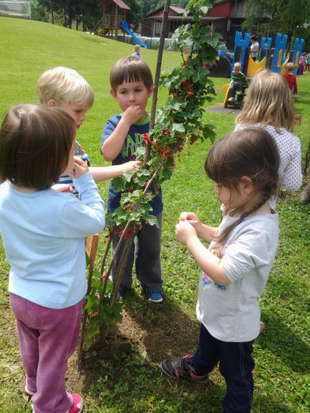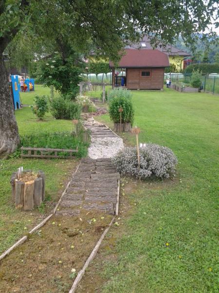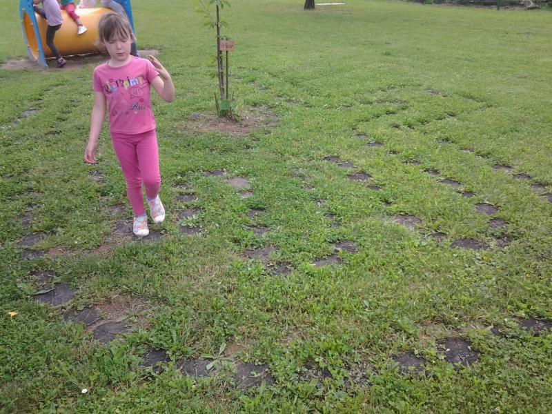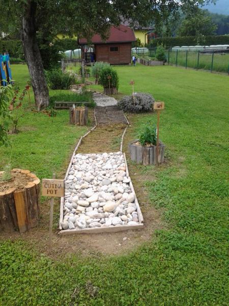 Na poti je glasbilo iz različnih vrst lesa,na katerega otroci igrajo. Na koncu pa še labirint v obliki krta. Ob strani poti rastejo sadna drevesa -dve jablani, hruška, češnja, dve mladi jablani, črni in rdeči ribez. Z njim smo se že posladkali, iz bezgovih cvetov pa naredili sok. Kamilice še sušimo...