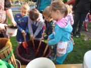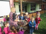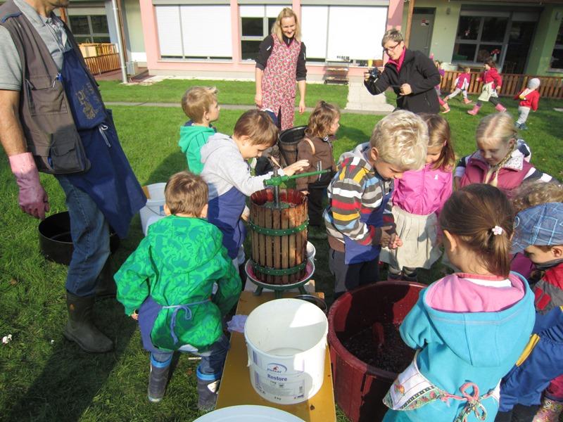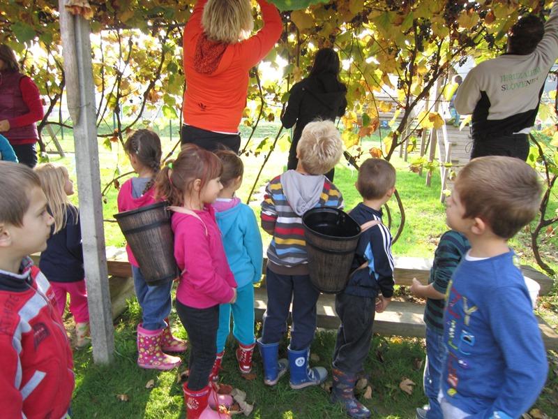 Ob prihodu v vrtec, so nas lepo sprejeli. Hitro smo si obuli škornje, nadeli predpasnike in »púte«, nato pa smo se lotili pobiranja grozdja. Obrano grozdje smo odnašali v »préšo«, kjer smo lahko takoj poskušali grozdni sok.