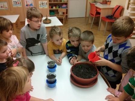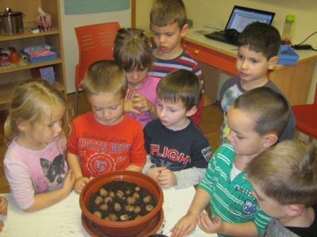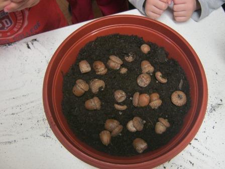 Tudi mi smo pripravili posodo, zemljo in želodke, ki smo jih posadili in zalili z vodo. Skrbno jih bomo zalivali in počakali, da iz njih zrastejo prava mala drevesa , ki jih bomo potem posadili v gozd.