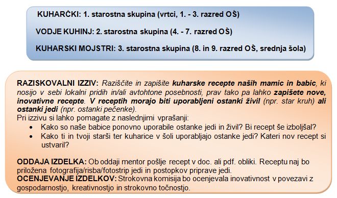 Oddaja izdelkov: Ob oddaji mentor pošlje recept v doc. ali pdf. obliki. Receptu naj bo priložena fotografija/risba/fotostrip jedi in postopkov priprave jedi.