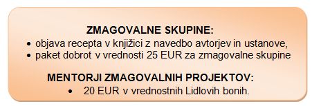 Vrtčevski otroci, učenci oziroma dijaki ter njihovi mentorji, ki bodo v natečaj prijavili enega izmed desetih najboljše ocenjenih receptov, bodo nagrajeni (nagrajene so skupine).