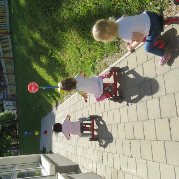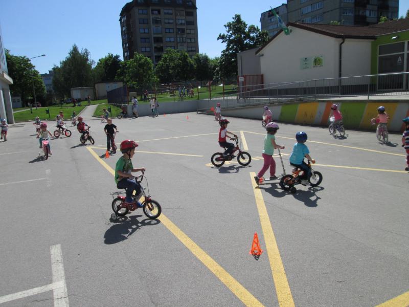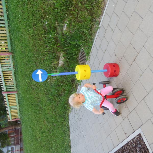 V skupinah prvega starostnega obdobja smo pripravili poligon, ki je vseboval dva prometna znaka, semafor in prehod za pešce. Za vožnjo smo uporabili vrtčevska kolesa, ki jih uporabljamo tudi pri drugih oblikah bivanja na prostem. Otroci so bili nad vožnjo po »cesti« navdušeni ter so vestno upoštevali prometno signalizacijo.