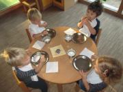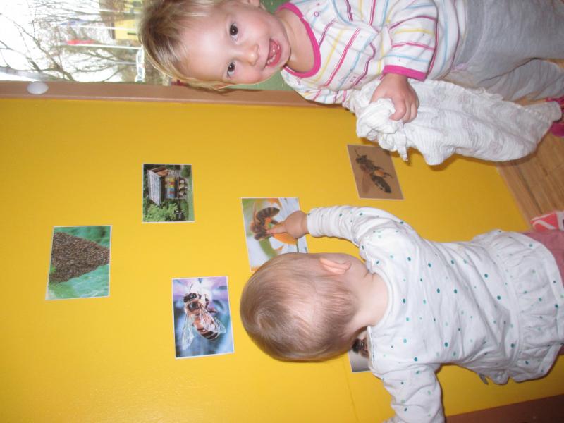 Otroci so ustvarjali s prstnimi in tempera barvami. Skupaj smo tako izdelali čebelice in čebelnjak, kateri krasi naš »čebelji kotiček«, kjer se otroci zmeraj lahko vračajo h knjigam , fotografijam, čebelnjaku, se tam igrajo ali samo opazujejo…