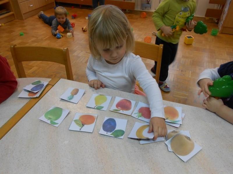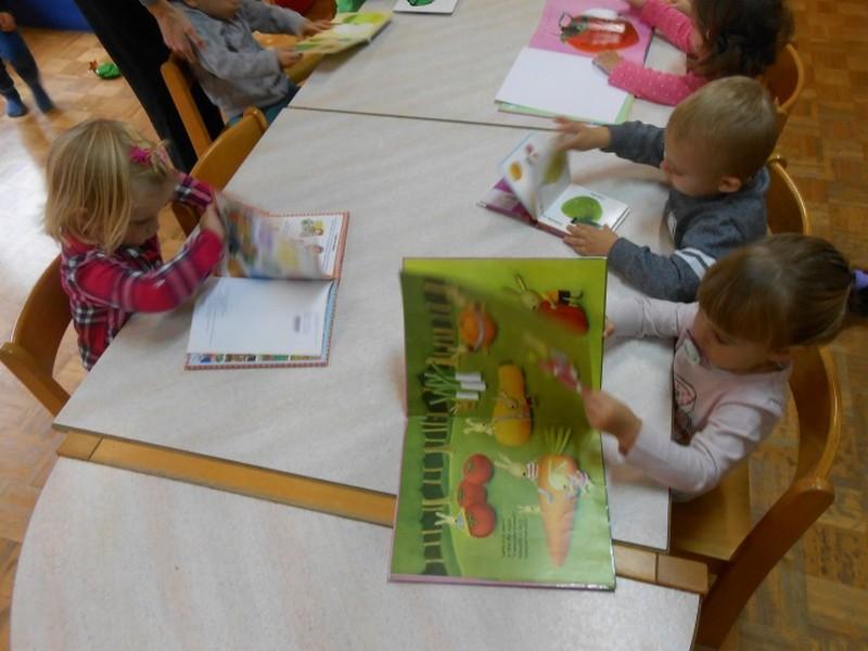 Ob slikovnem plakatu smo skupaj poimenovali določeni sadež ali zelenjavo in ob prebiranju otroških knjig, kartonk, slikanic o prehrani, smo spoznavali pomen besede zdrava in nezdrava prehrana.