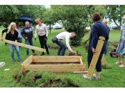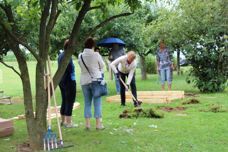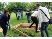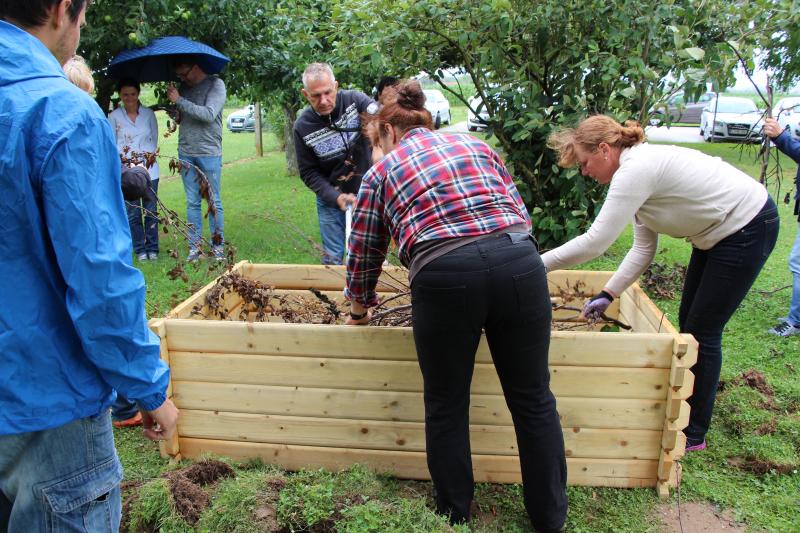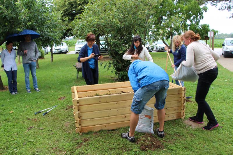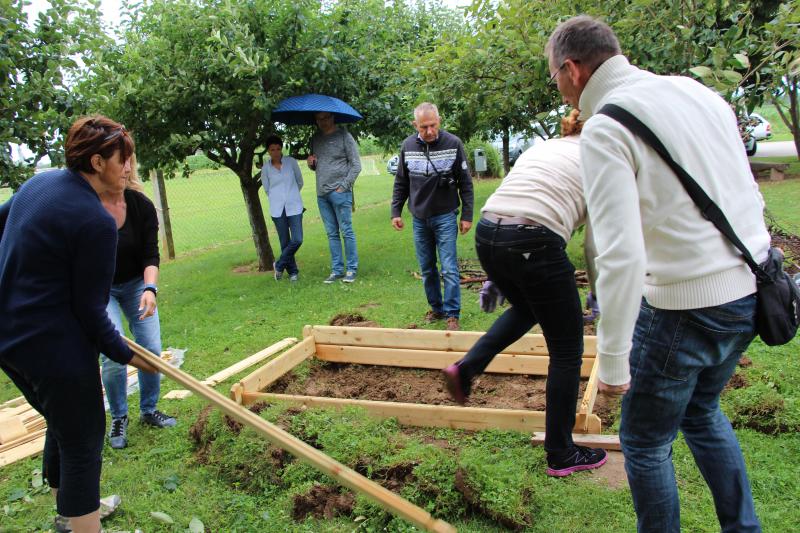 Praktični del in postavitev visoke grede je izvedla ga. Majda Veis iz Semenarne Ljubljana. Udeleženci izobraževanja so postavili dvignjeno gredo.