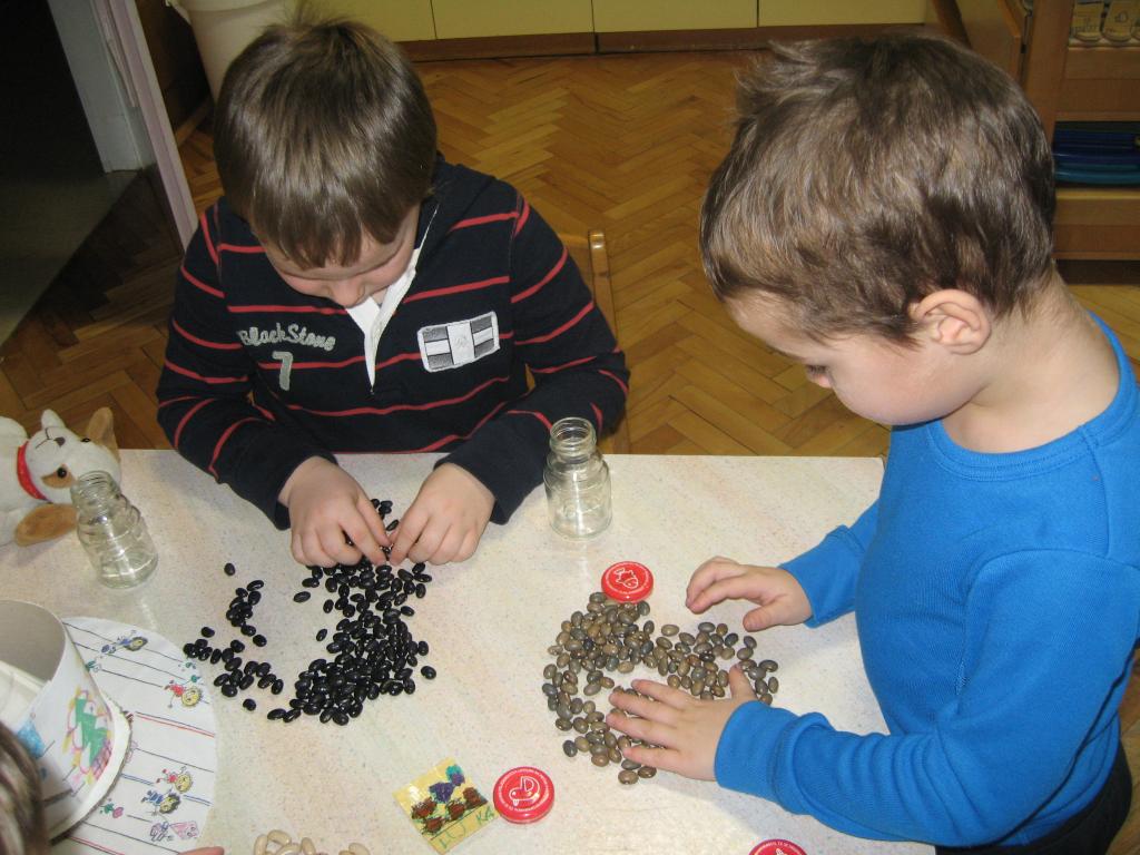 Fižolova zrna so otroci sortirali po barvi, nakar smo nekatere sorte poskusili tudi poimenovati.