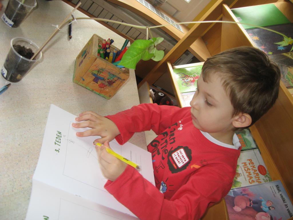 Vsaki dan pridno opazujemo rast ter tedensko beležimo v dnevnik. Otroci tudi z veseljem pripovedujejo o rasti fižola doma ter primerjajo in ugotavljajo razlike pri rasti.Najbolj zanimivo je otrokom ob ponedeljkih, ko so spremembe, ki so nastale čez vikend, bolj vidne.