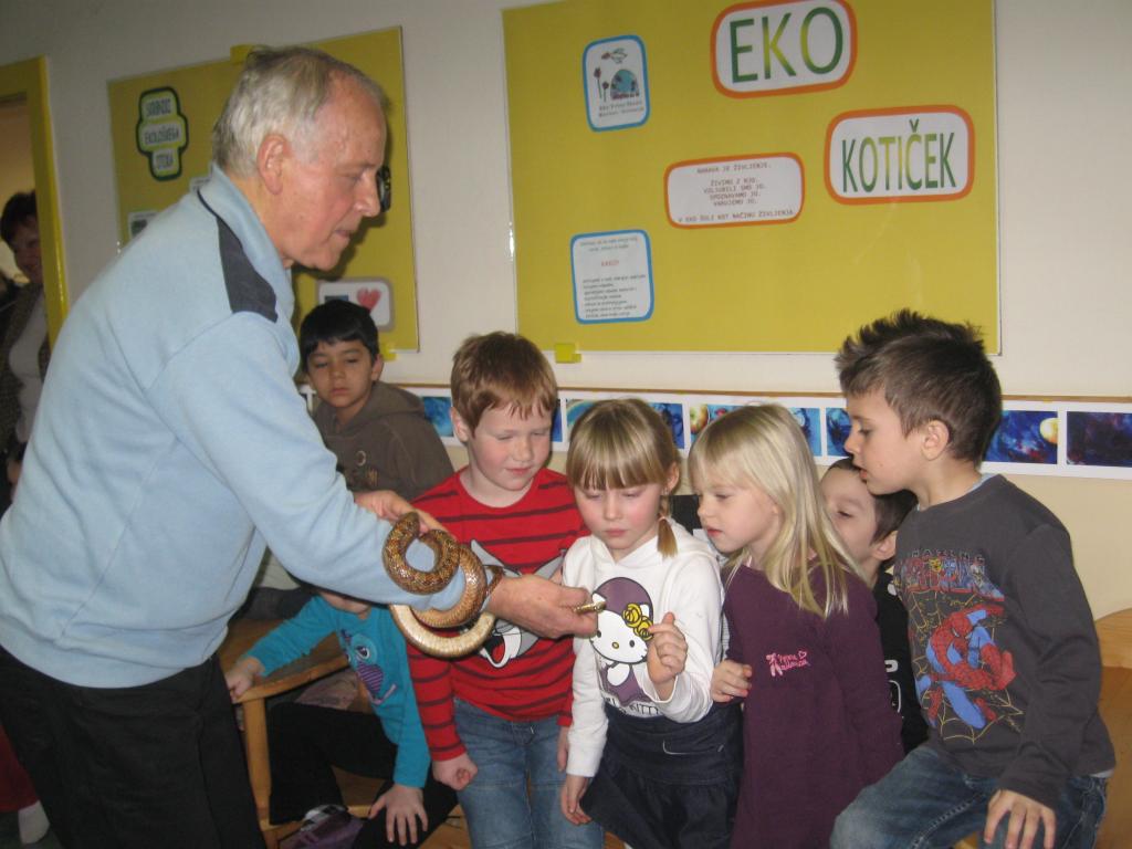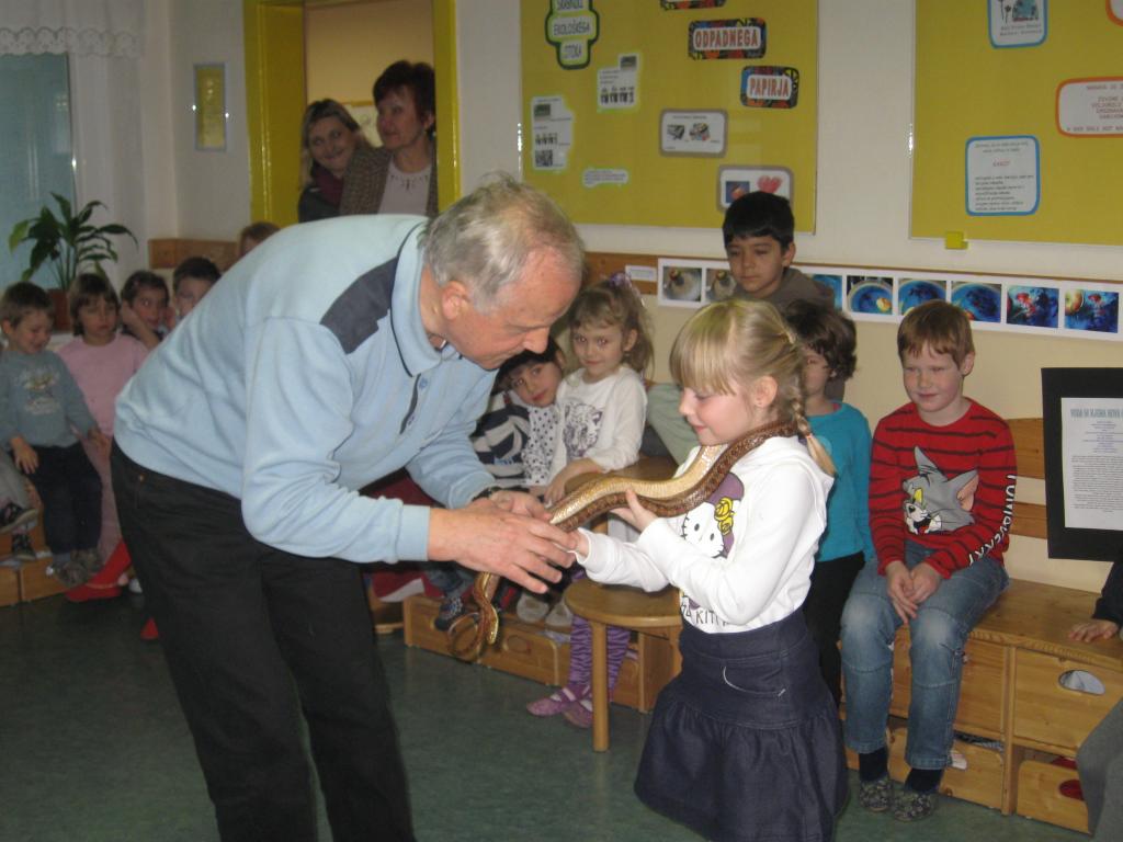 V začetku šolskega leta smo veliko razmišljali o projektu ZGODNJE NARAVOSLOVJE V VRTCU. Otrokom smo želeli predstaviti nekatere živali, ki v našem okolju niso tako pogoste, oz. se otroci z njimi ne srečujejo. Naš cilj je bil, da se otroci otresejo strahu pred njimi. Tako smo na obisk povabili biologa g. Ocepka.