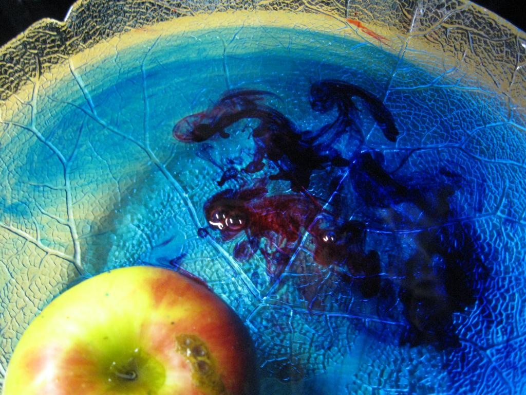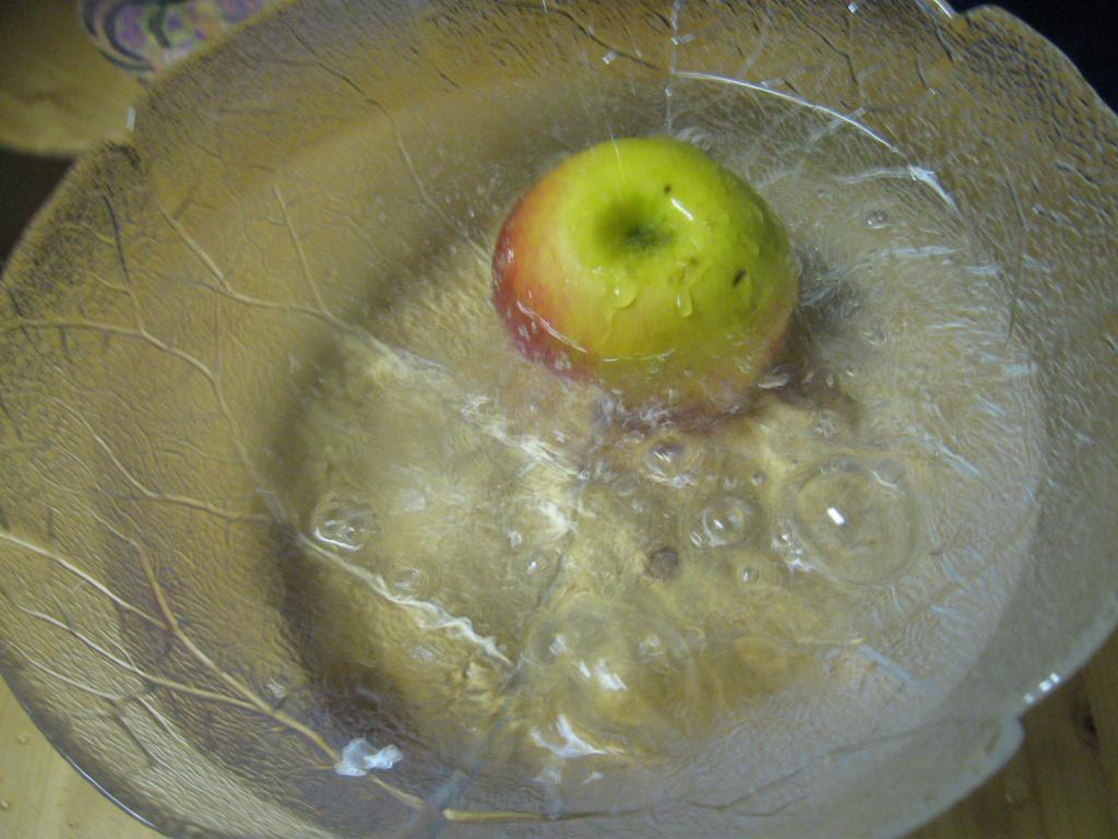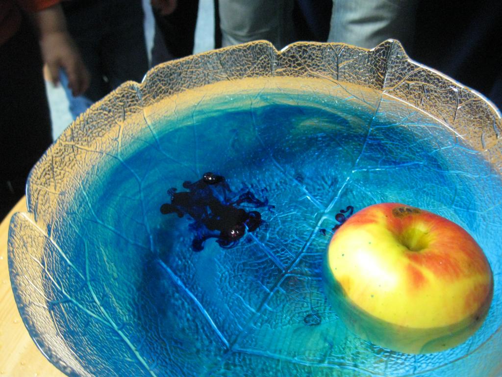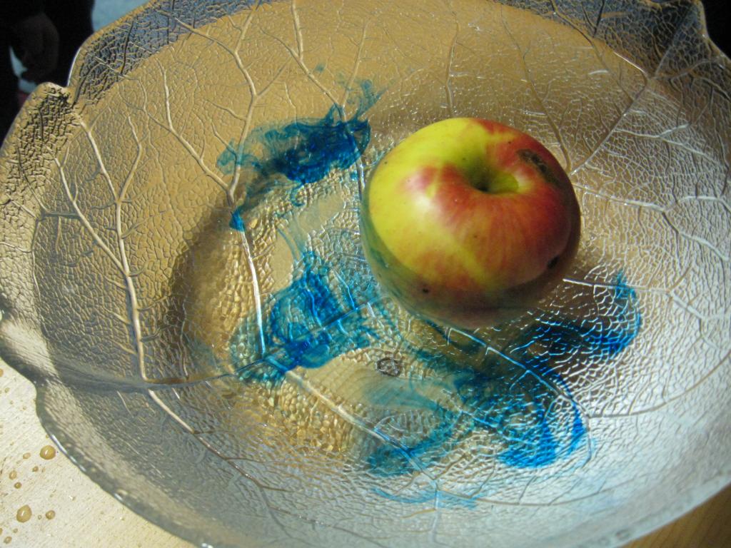 Nekega dne smo začeli raziskovati, kaj pluje in kaj potone. Po vrtcu smo poiskali različne predmete, med njimi tudi jabolko. Otroci so preizkušali plovnost predmetov in bili najbolj navdušeni nad jabolkom, ki ne potone. Igrali smo se in naenkrat ugotovili, da je voda brezbarvna. Ali jo lahko obarvamo? Poskusimo! Tako smo kanili v vodo kapljico modrega tuša, nato še eno in še eno. Barva vode se je spreminjala, pojavljale so se ''strupene packe'' različnih oblik, kot so jih poimenovali otroci. Dodali smo še rdečo barvo in packe so se pomešale, voda je bila sprva modra, nato ponekod rdeča, z mešanjem je postala vijolična in na koncu skoraj črna. Na njeni gladini je plavalo rumeno rdeče jabolko.